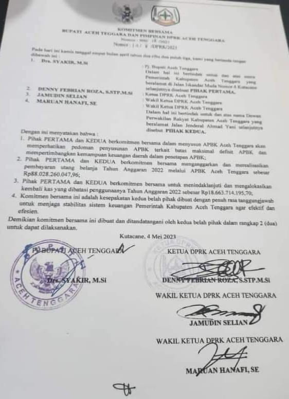 KUTACANE, BIDIKNASIONAL.com –Beredarnya dokumen negara beberapa waktu lalu sempat menyita perhatian publik, Diketahui dokumen itu merupakan hasil komitmen bersama antara ekskutif dan legeslatif. Seperti halnya dalam surat itu sebagai pihak pertama. Drs, Syakir, M.Si Pj Bupati Aceh Tenggara dalam hal ini bertindak untuk dan atas nama Pemerintah Kabupaten Aceh Tenggara dan pihak kedua. Denny Febrian …